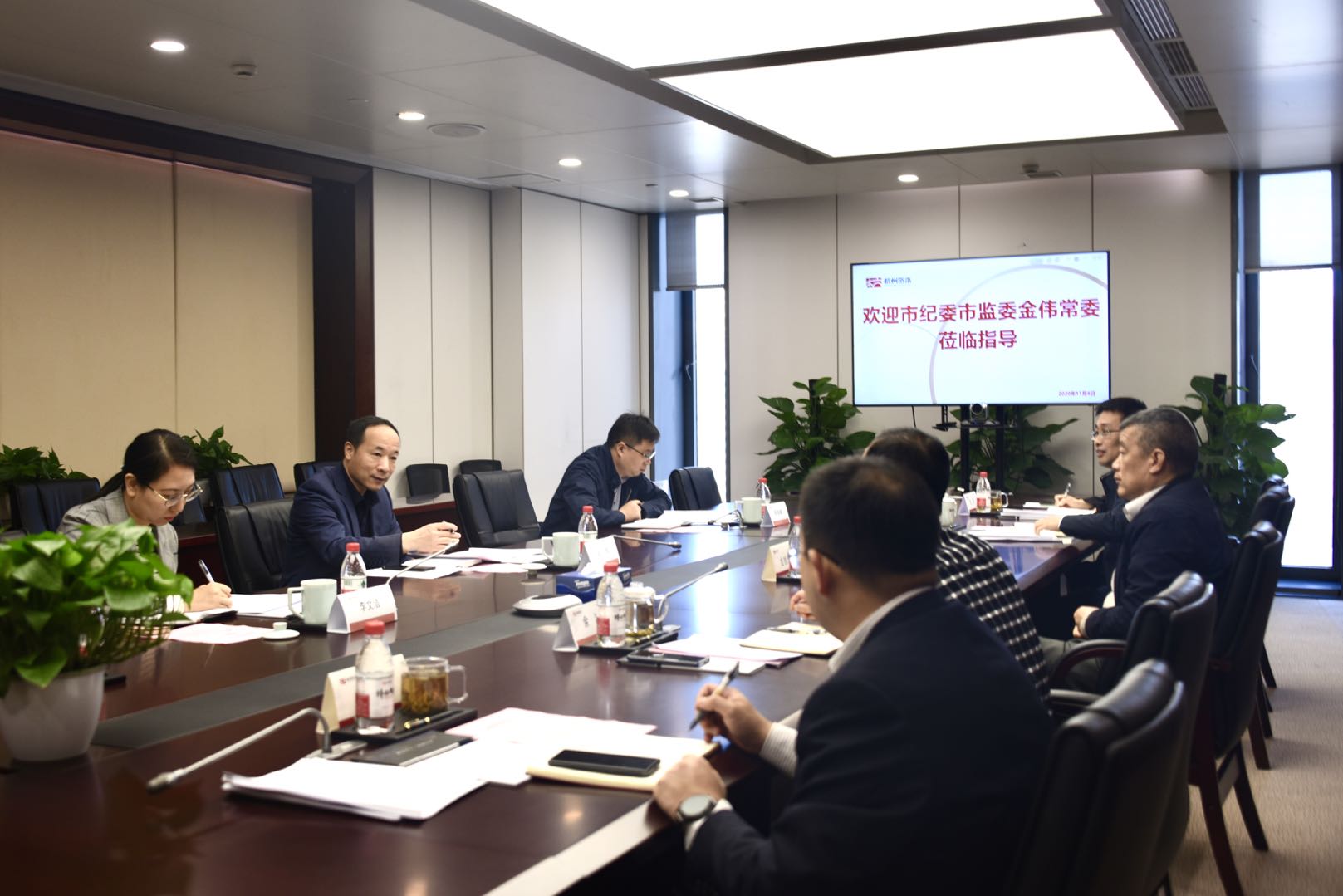 11月4日上午,市纪委常委、市监委委员金伟一行三人来杭州资本调研指导,公司党委书记、董事长金旭虎、纪委书记余波、办公公室、纪检室、组织人事部负责人参加座谈交流。